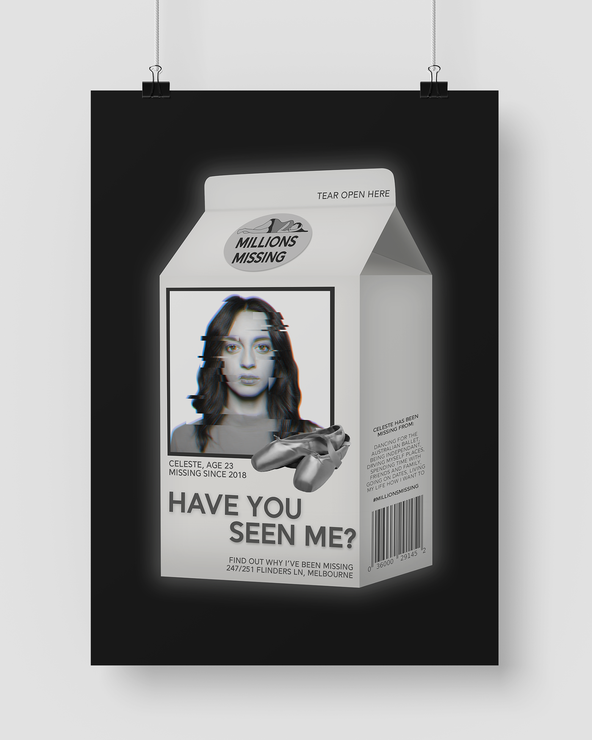 For my Interior Architecture honours project, I designed a storytelling arena which shares the poignant stories of those living with the poorly misunderstood condition ME/CFS (Chronic Fatigue Syndrome). As part of the project, these posters were designed to advertise the space in an evocative way with milk cartons being used to reflect the fact that those living with ME/CFS are missing from their pre-illness lives.